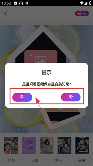 4、保存时会弹出提示框,选【是】观看视频就能将拼图保存到变美记录,方便后续查看哦。