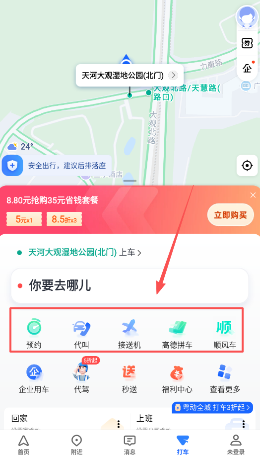 5、点击打车选项能够一键进行打车,更多的打车服务选项可以在里面体验,大家可以快速搜索自己的服务内容进行查看。