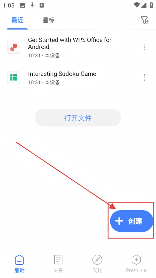 1、在WPSOffice界面,找到右下角蓝色的【+创建】按钮,点击它就能开启创建新文件的操作啦,超方便的呢。
