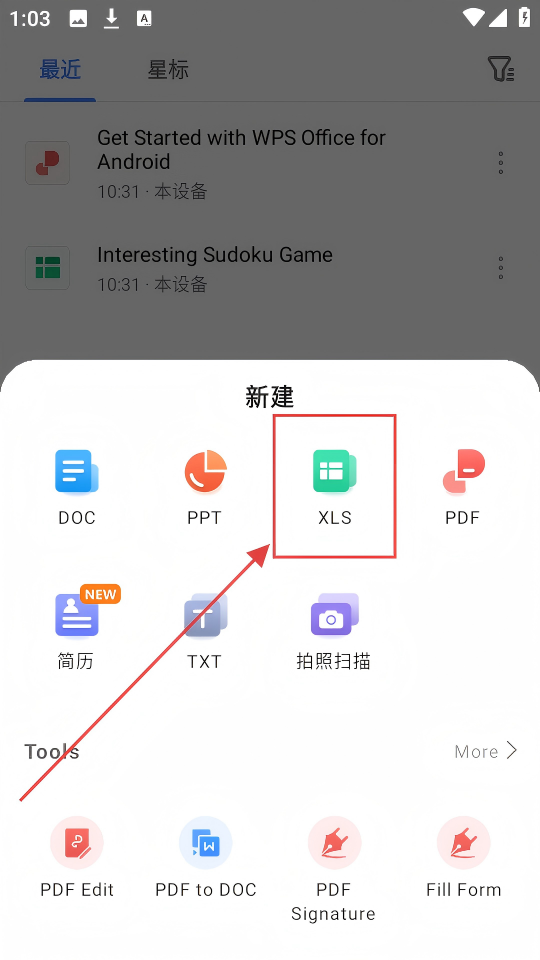 2、点击【+创建】后,在弹出的“新建”选项里,找到【XLS】图标并点击,这样就能开始创建表格文件咯。