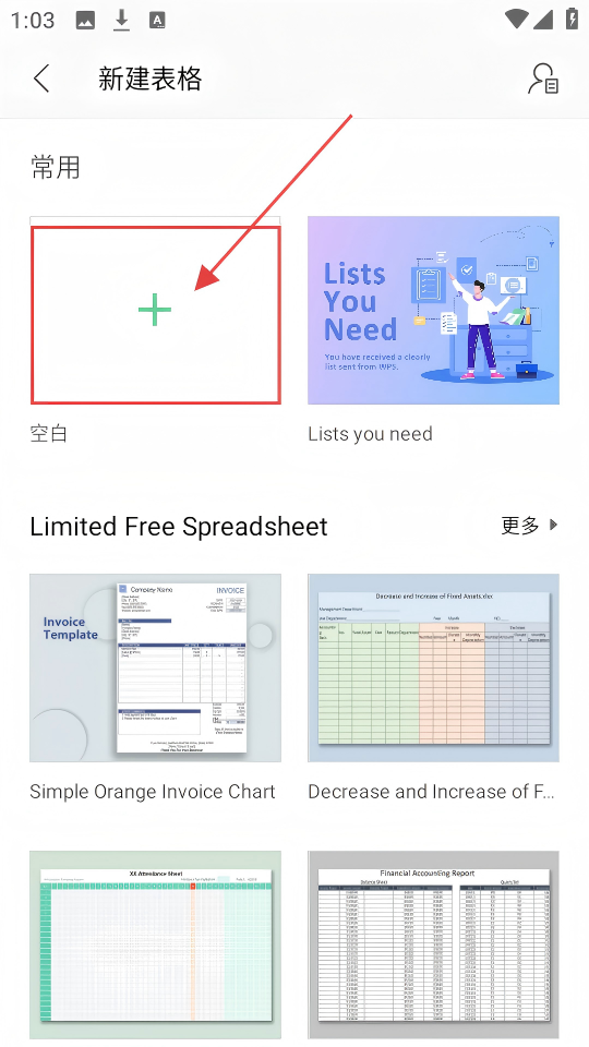 3、进入“新建表格”页面,在“常用”区域找到带绿色+号的【空白】选项,点击它就能创建一个空白表格,很简单的哟。