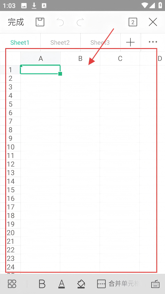 4、创建好空白表格后,就进入了表格编辑界面,这里有A、B、C等列和1、2、3等行组成的单元格,可开始编辑内容啦。