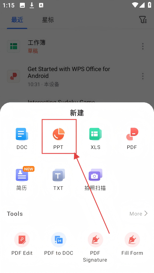 2、点击【+创建】后,在弹出的“新建”选项里,找到【PPT】图标并点击,这样就能开始创建演示文稿咯。