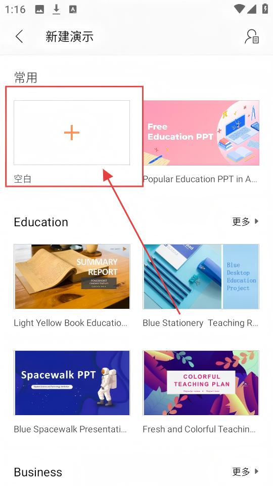3、进入“新建演示”页面,在“常用”区域找到带橙色+号的【空白】选项,点击它就能创建一个空白演示文稿,很简单的哟。