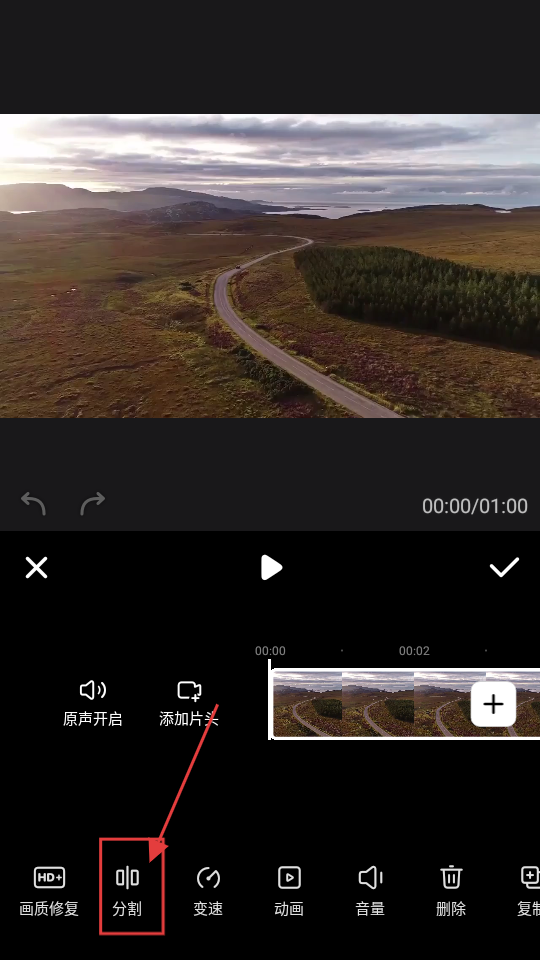 2、点击【分割】功能,可将视频分割成多个片段,方便对不同片段编辑啦。