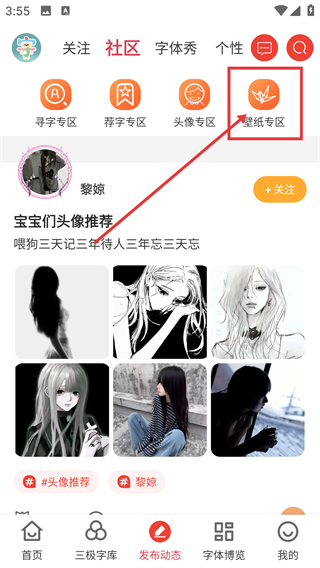 2、进入社区页后,点【壁纸专区】选项,就能进入壁纸资源界面,查看各类分享的壁纸内容哦。
