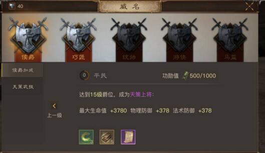 提升自身的侯爵等级后,可以获得对应爵位的属性,每升级一次也可以获得封赏。