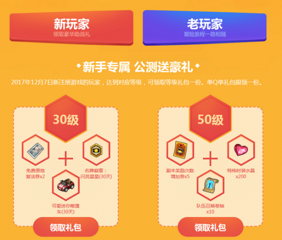 2017年12月7日新注册游戏的玩家,达到对应等级,可领取等级礼包一份。单Q单礼包限领一份。