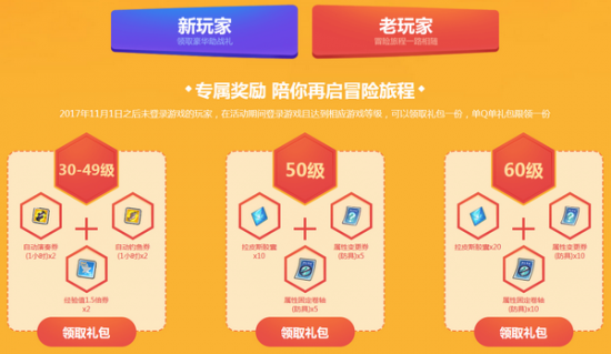 2017年11月1日之后未登录游戏的玩家,在活动期间登录游戏且达到相应游戏等级,可以领取礼包一份,单Q单礼包限领一份