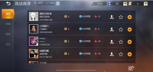 观战推荐部分共分为四个模块,分别是:发现,同城,好友和关注,玩家可以自由选择观战对象进行观战。