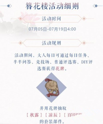 云裳羽衣花牌奖励:可以在簪花楼中抽取特殊活动套装,【秋露】【凉辰】【百邪】。