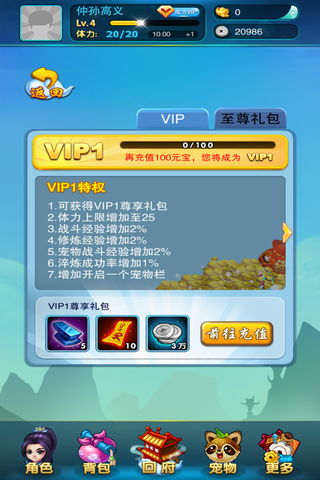 二.然后再来给大家介绍一下成为了vip完家之后,你都能够拥有一些什么样的特权。成为了vip完家之后你能够比其他的玩家多很多的功能。如果你是VIP玩家的话,那么你的体力值上限会比普通玩家要高很多,而且你在战斗当中度过的的战斗经验值也会比普通的玩家多。你的修炼经验值也将会更多。你能够拥有的宠物也要比普通的玩家多。并且最爽的那就是存为了vip玩家之后,你不仅仅能够得到各种各样的特权,而且你还能够让自己得到属于vip玩家闷的专属VIP礼包。在VIP礼包当中所存在的资源都是一些很珍贵,对自己非常有帮助的材料。