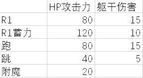 一些简单招式的基本攻击力和对躯干的伤害值。躯干伤害这个数是数据中的基本值以及攻击被敌人防御的情况下造成的伤害,而未被防御的情况下似乎是2倍,但这个倍数也可能是随敌人而变化的。完美格挡的躯干伤害基础值似乎是45,但这个可能也是随敌人和招式变换的。