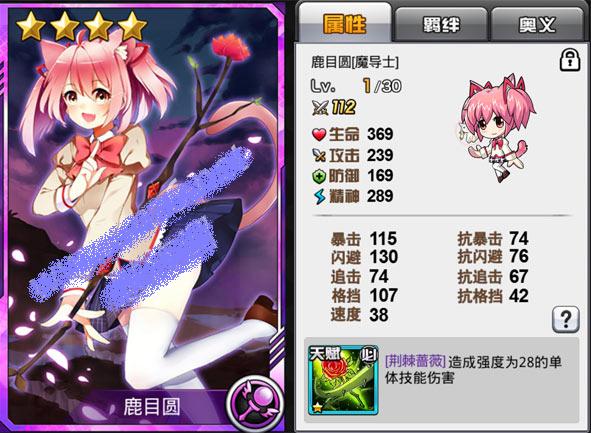 想要获得鹿目圆是需要从商店召唤,或者是通关8和21章节获得。鹿目圆的天赋技能荆棘蔷薇可以造成二十八的单体伤害。鹿目圆的奥义是秘能还有如风,秘能可以给鹿目圆增加三百点的精神属性,而如风奥义则可以给鹿目圆增加十三点的闪避能力。