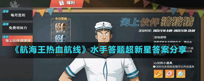 航海王热血航线中今天为各位玩家们带来水手答题活动,开启的主题超新星的答案活动,玩家参与到活动其中即可确有机会得到奖励,同时如果回答问题还能得到更加丰厚的礼品,那么其中的答案又是什么呢,下面973游戏网小编为大家带来《航海王热血航线》水手答题超新星答案分享,一起来看看吧。