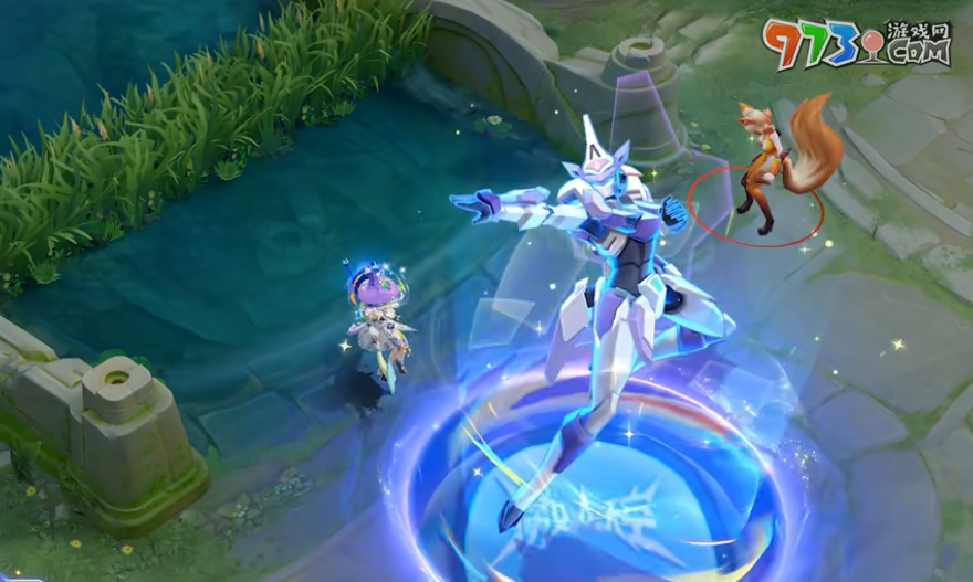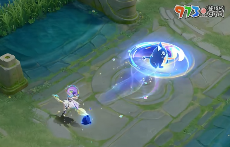 1、一技能绽放之舞。向前方扔出电视猫玩偶,对敌人造成法术伤害。