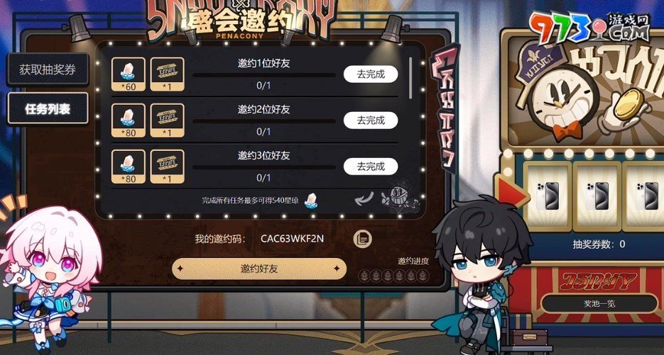 答:我们可以在匹诺康尼活动页面点击左边的获取抽奖券填写邀约码,即可获得星琼奖励。