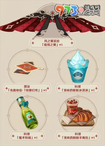 PS:内含风之翼装扮肴馔之翼x1、摆设奇趣地毯纸牌幻戏x1还有一些特殊料理