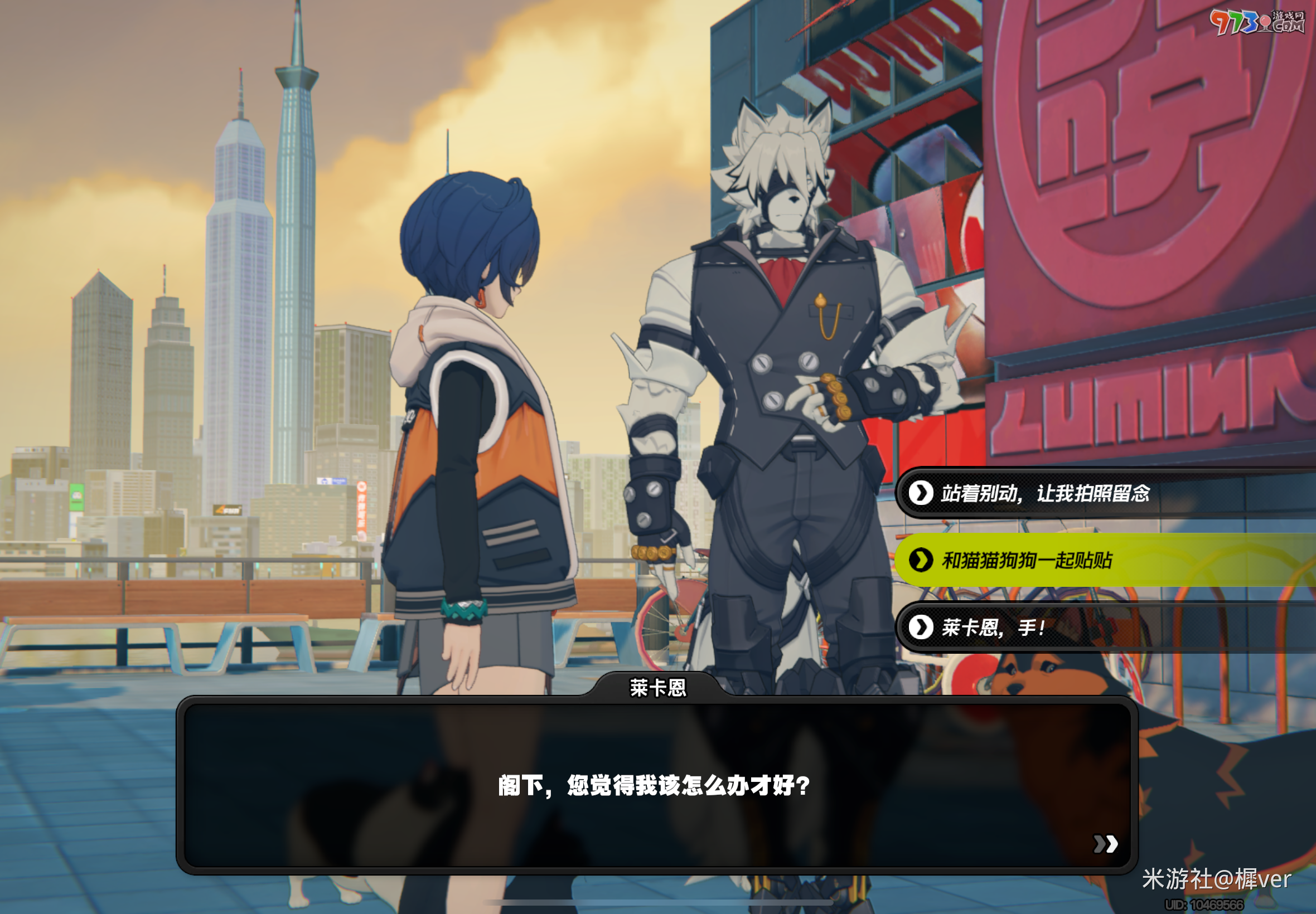 与他对话,当莱卡恩询问怎么办时,选择“和猫猫狗狗一起贴贴”