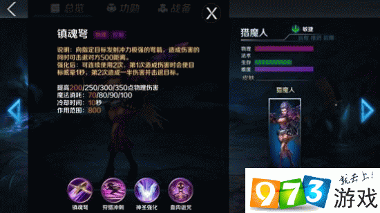 镇魂弩,是猎魔的一个控制技能,4级之后可以定身1秒,第二次是击退,4级可以先升隐身,或者是这个技能,打团的话可以先升级这个技能,帮助队友控一手,对线建议先学隐身技能,这个镇魂弩的控制是很不错的,大家可以先控制住,然后a两下,然后击退,他肯定还没反应过来继续追你,然后继续a,他还追就向后位移,要是逃跑就向他那面位移,黏到死。