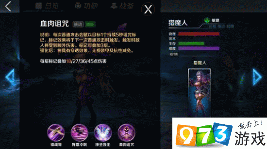 先介绍一下她的各项技能,我现在还没搞清楚猎魔是男是女, 先说说她的被动血肉诅咒,是猎魔的核心技能,他前期的输出基本全是靠这个技能,第三层之后,不论打什么英雄都是很痛的,猎魔主这个被动是肯定的了,这个技能配合大魔神的粘人效果是很不错的。