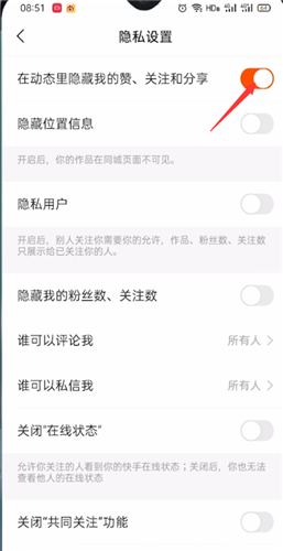 4、在隐私设置中会在最前面也就是动态中隐藏我的赞,关注、分享。