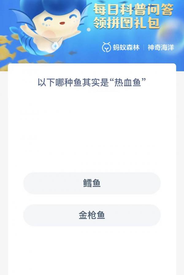 在今天的支付宝神奇海洋题目中所提出的询问也是非常直接的,需要大家在鳕鱼和金枪鱼两种鱼类中做出选择找到哪一种材质热血鱼的题目,正确回答之后是可以收集得到海洋碎片从而合成最终的物品,下面小编为大家带来详细具体的答案内容解析感兴趣的小伙伴可以一起了解下。